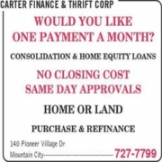 Carter Finance is located in Mountain City, Tennessee and offers multiple Personal Financing. They have Same Day Approvals, Personal Small Loans, Mobile Home & Land Loans, Automobile & Truck Loans, 1st & 2nd Home Mortgages, Electronic Filing, Cash Loans and Bill Consolidation Loans. They do not require Up Front Fees or Closing Cost. If you feel you may need any of their services please give them a call or drop by their office and speak to a staff agent.